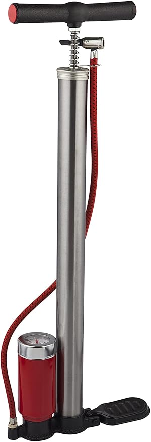 Bomba de ar tipo manual com altura de 50 centímetros. Com manômetro para verificar a pressão. Acompanha uma mangueira extra. Tanque duplo.